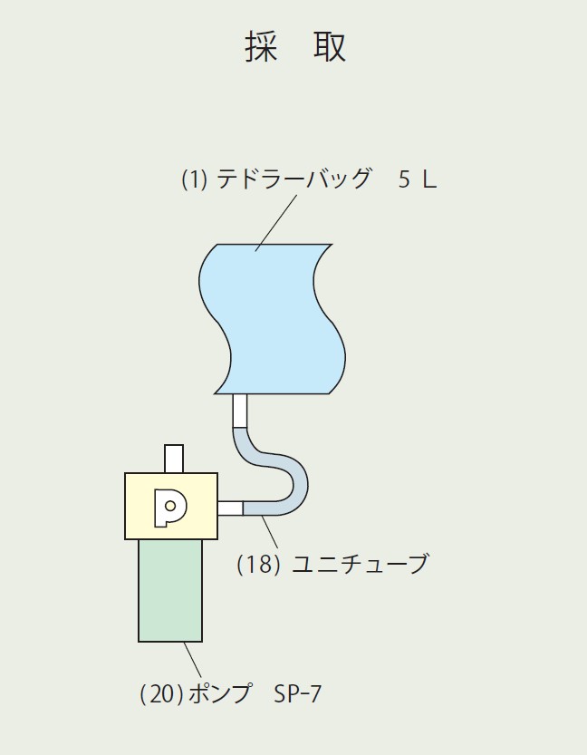 | 直接採取法 | 直接ポンプで吸引し、ポンプ出口に取り付けたテドラーバッグ(5L)に採取します。 ポンプは、ガス流通部が交換できるものを使用します。 |