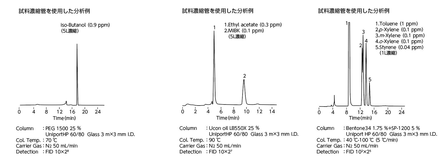 敷地境界線における濃度測定、気体排出口における濃度測定( イソブタノール、酢酸エチル、メチルイソブチルケトン、トルエン、スチレン、キシレン) 用の分析セットです。採取~ガスクロマトグラフへの導入まで必要な製品をセットにしています。
