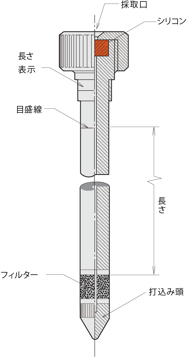 MU式採気採水管は、GC、LC、溶存ガス分析装置などで土壌汚染の分析や水質汚濁の分析を行う際、現場からの試料採取に威力を発揮します。希望の深さの所へ採気採水管を差し込み(または埋め込み)上部のシリコンセプタムから、注射器やポンプで試料が採取できます。また、通気・通水管としても利用できます。