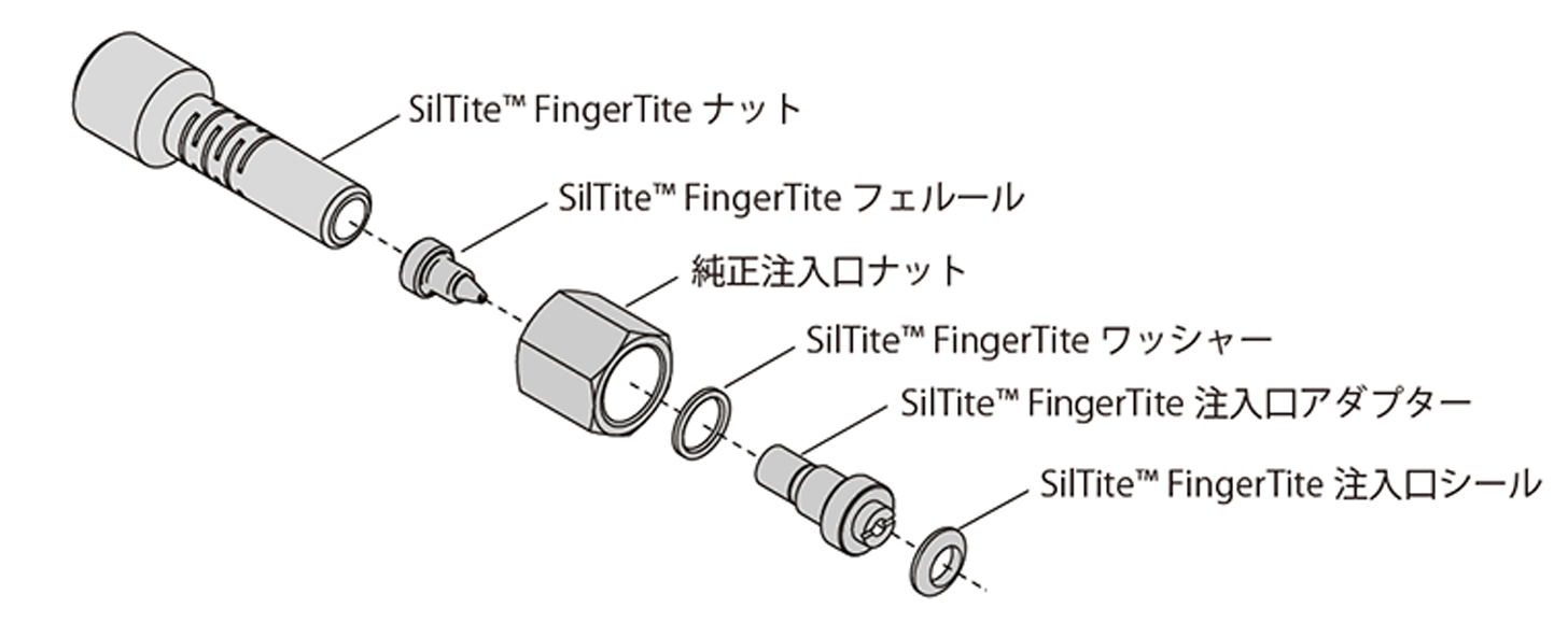 Siltite Finger Titeは、工具を使わずに手締めだけで、手早く簡単にGCキャピラリーカラムの取り付けができるコネクターです。 専用ナットとSilitite金属フェラルで構成されており、リークの心配がなく、昇温・降温の際も増し締めが必要ありません。