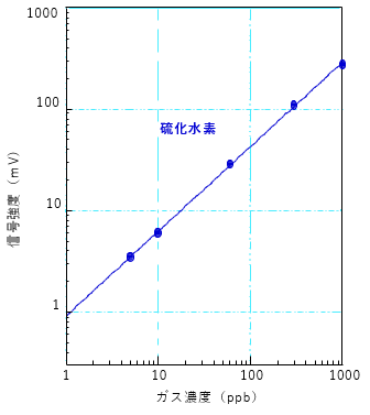 半導体ガスセンサーの特性上、ガス濃度の対数と信号強度の対数が比例関係を示します。
