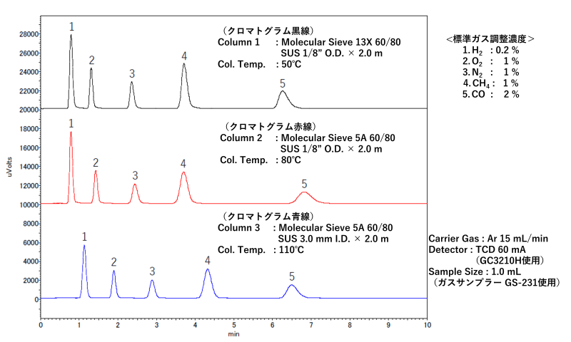パックドカラムで用いられるモレキュラーシーブには、5A型および13X型があります。5A型は一般的に保持力が強く、使いやすいという利点がありますが、COの保持が過剰になりやすいという欠点があります。その場合には、カラム温度を調整することで、13X型と同等の分離性能を得ることが可能です。