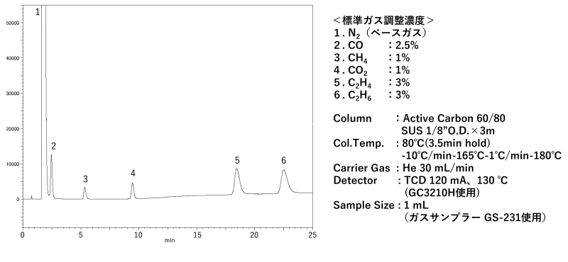 また、CH₄(メタン)、C₂H₂(アセチレン)、C₂H₄(エチレン)、C₂H₆(エタン)、C₃H₈(プロパン)、C₄H₁₀(ブタン)などのC₁~C₄の炭化水素ガスの分離にも適しています。ただし、保持時間の長い成分ではピークの対称性が得られにくいため、比較的高温条件での分析や短いカラムの使用が推奨されます。さらに、水分を含むガスの分析も可能ですが、水はActive Carbonに吸着されるためクロマトグラム上にはピークとして現れません。