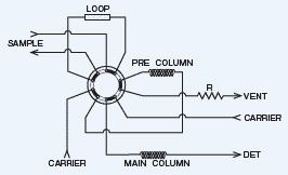 10方切換バルブを使用して、ガスサンプリングとバックフラッシュを行える点は前ページのガスサンプリング・バックフラッシュと同様ですが、このバルブシステムでは2本の異なった分析カラムを使用します。メインカラムを劣化させる成分が含まれているサンプルを、サンプルにより劣化しないプレカラムで粗分離してメインカラムに導入します。カラムを劣化させる成分はバックフラッシュすることにより系外に排出します。
