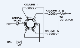 1本の分析カラムより他の分析カラムへバックフラッシュすることにより、1台のGCで同時に多成分系のサンプルガスを分析できます。カラム1で不用成分を系外に排出し、カラム2とカラム3を切り替えてそれぞれの成分が分離できるカラムへ、流出時間のタイミングをみながら切り換えて分析を行います。