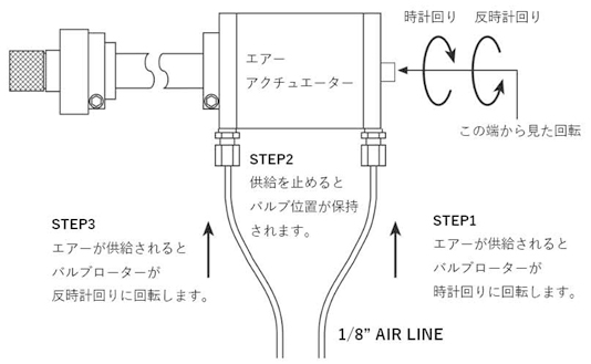2ポジションのエアーアクチュエーターは、2つあるエアー供給口のいずれかに圧力を加えることで、バルブが切り替わります。