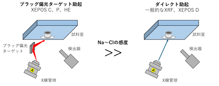 粉体および液体試料中のNa~Cl範囲の軽元素をより高感度に分析するために、ブラッグ偏光励起を特長とするSPECTRO XEPOS C、P、HEを利用することが可能です。他の多くのEDXRF装置は、軽元素の励起にダイレクト励起を採用しており、ブラッグ偏光励起と比較すると感度が低くなっています。XEPOSのモデルでいえば、ダイレクト励起を用いるSPECTRO XEPOS Dがより近い性能を発揮するでしょう。