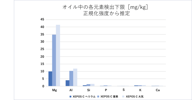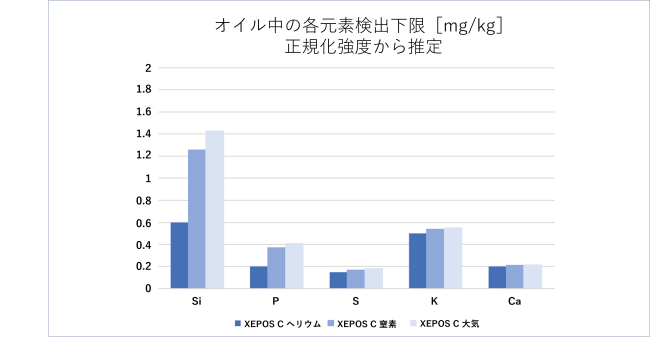 ヘリウムと比較し強度が低くなるため、検出下限への影響もあります。これは、正規化強度から推定することができます。次の図2および図3は、SPECTRO XEPOS Cを用いたオイル試料の分析における検出下限への影響を