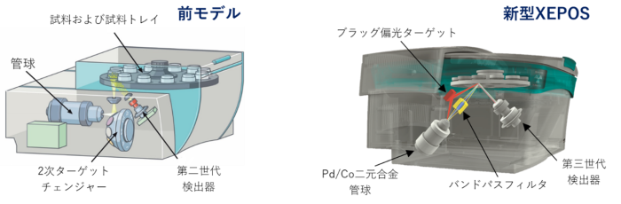 最大1,500,000cpsでの測定が可能となった検出器の性能を最大限活用するため、カルテシアン・ジオメトリに複数の2次ターゲットを搭載した3次元の偏光光学系(下図左)から、感度のロスを低減するために、管球の1次ターゲットをPdとCoの合金とした上でダイレクト励起をベースとした光学系へと変更(下図右)。感度のロスなくPd励起とCo励起両方の利点を享受できます。さらなる高感度化のために、軽元素(Na~Cl)に有効なブラッグ偏光ターゲットやK~Mnの範囲に有効なバンドパスフィルタを搭載したものをモデルオプションとして用意しました。