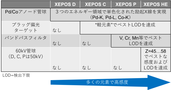 XEPOS D、C、P、HEの4つのモデルを用意しました。分析対象となる種々のマトリックス(主成分)において、選択された元素グループに対する分析パフォーマンスを最大化させます。お客様のニーズに合わせ、費用対効果に優れたモデルを選択可能です。