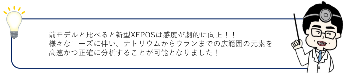 | 励起 | ・空冷のPd/Co二元合金アノード管球 ・最大出力:50W ・最大電圧:50kV(XEPOS HEで60kV) ・適応性に優れた励起システムと最適化された複数の一次フィルタ ・Na~Clの範囲で改善された感度を達成するためのHAPGブラッグ偏光ターゲット (XEPOS C, P, HEに標準搭載) ・K~Mnの範囲で改善された感度を達成するためのバンドパスフィルタ (XEPOS P, HEに標準搭載) |