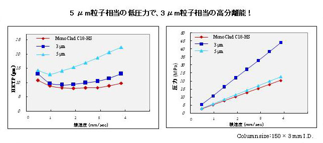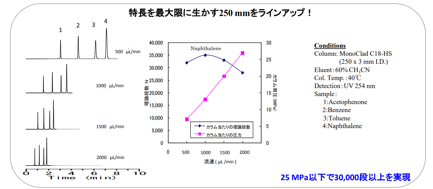 MonoCladシリーズは、スルーポアとメソポアの二重ポア構造をもつ円柱状のシリカ連続体を分離担体としたHPLC用シリカモノリスカラムです。低いカラム背圧を維持しながら高分離能を実現しました。