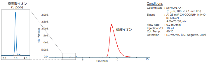 陰イオン類の分離能を持ち、低い塩濃度の移動相では夾雑イオンを溶出することができるため、水中の臭素酸分析などに適しています。