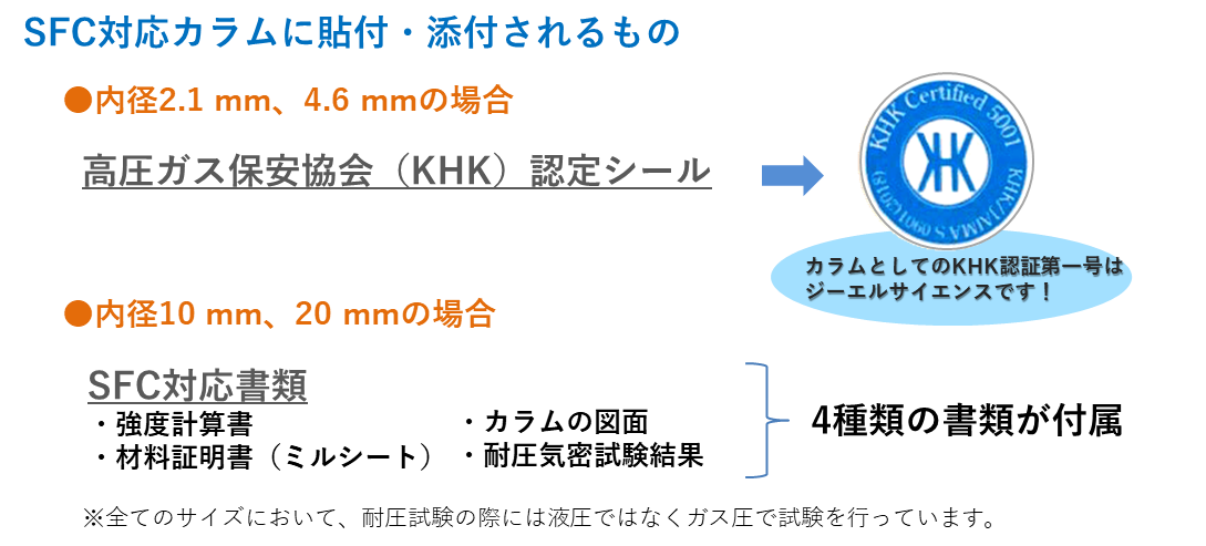 弊社の内径2.1mm及び4.6mmのSFC対応カラムは高圧ガス保安協会による審査に合格し、KHK/JAIMA S 0901(2018)に適合しているという認定をいただいております。