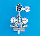 半自動切替減圧弁の左右に接続されたボンベのうち、いずれか一方の系列よりガスを供給して行き、一方のボンベが空になると、他方の系列に自動的に切り替える装置です。