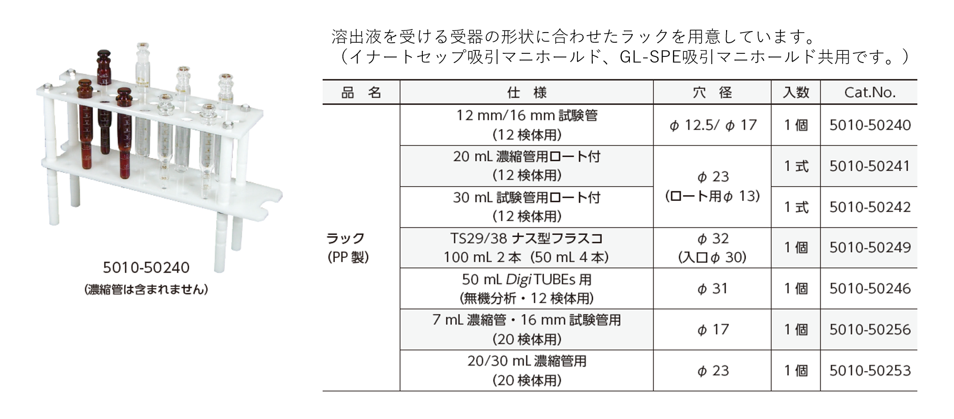 GL-SPE濃縮管は、1.0mLまたは0.5mLに校正されたメス目盛りが刻まれており、サンプルの定容が容易にできます。ラックを用いることにより、イナートセップ吸引マニホールド・GL-SPE吸引マニホールドで使用できます。