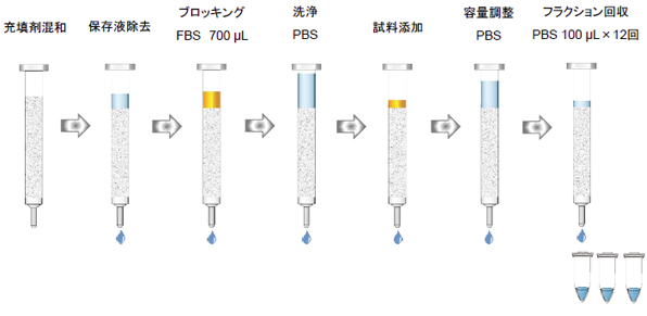 注)初回は抗CD9-抗CD63サンドイッチELISAや、抗CD9ウェスタンブロッティングなどでエクソソーム溶出位置、Bradford法などにより(血清)フリータンパク質の溶出位置を確認してください。2回目以降同じサンプルを使用した際は、溶出位置の確認は必要ありません。