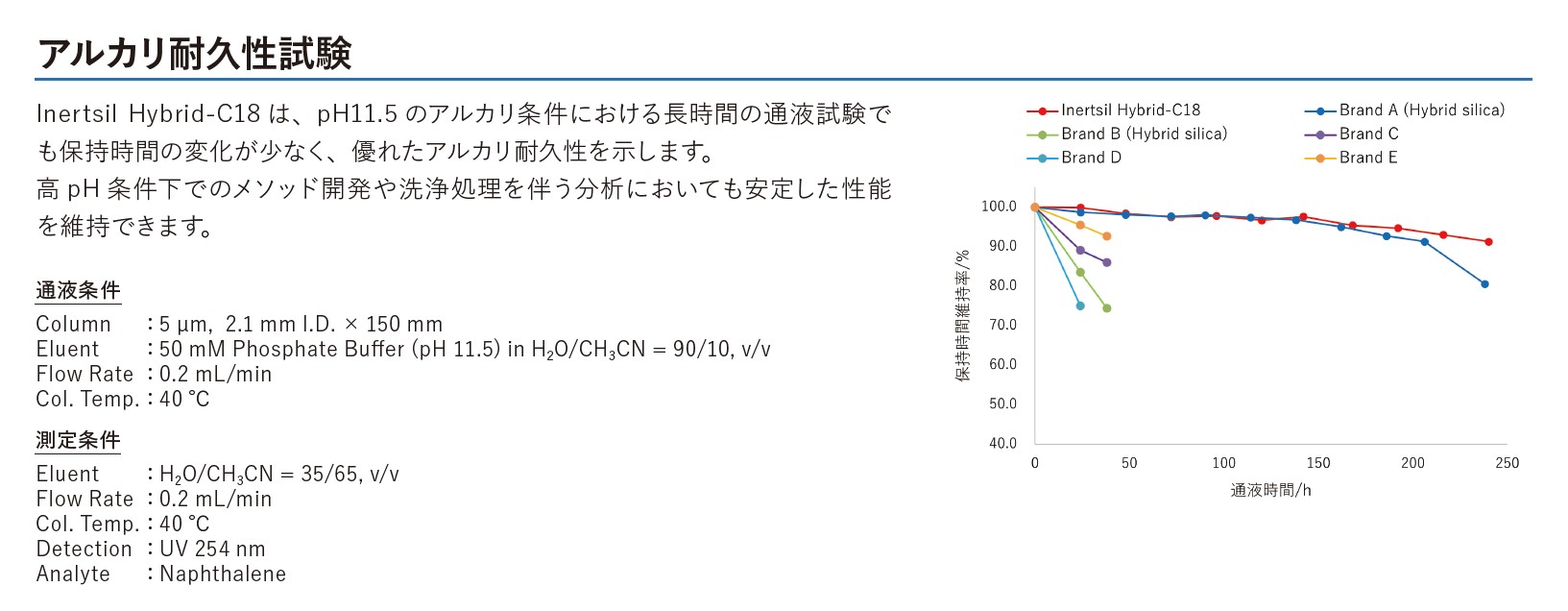 新たに開発した全架橋型ハイブリッドシリカゲルを採用し、今までにない不活性度を実現したODSカラムです。水100%溶離液で使用できることはもちろん、今までのシリカゲルに比べ、過酷なpH条件(pH12)や高温下でも安定した性能を発揮します。メソッド開発の自由度が高く、多様な分析ニーズに柔軟に対応する、『次世代のファーストチョイスカラム』です。