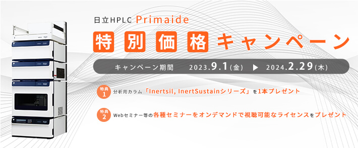 | 概要 | DAD システムセット 通常価格 6,778,900円 ⇒ 特別価格 3,600,000円 <内訳> ・フォトダイオード アレイ検出器 ・3次元データ対応ワークステーション(PC 付) ・冷却機能付きカラムオーブン ・200 検体対応 オートサンプラー ・4液グラジエントポンプ (脱気装置付き) ※別途、据付調整費が必要です。 UV システムセット 通常価格 6,017,900円 ⇒ 特別価格 3,200,000円 <内訳> ・UV 検出器 ・ワークステーション(PC 付) ・冷却機能付きカラムオーブン ・200 検体対応 オートサンプラー ・4液グラジエントポンプ (脱気装置付き) ※別途、据付調整費が必要です。 蛍光システムセット 通常価格 6,578,900円 ⇒ 特別価格 3,600,000円 <内訳> ・4液グラジエントポンプ (脱気装置付き) ・200検体対応 オートサンプラー ・冷却機能付きカラムオーブン ・蛍光検出器 ・オーガナイザー ・ワークステーション(PC付) ※別途、据付調整費が必要です。 マニュアルUV システム 通常価格 2,305,400円 ⇒ 特別価格 1,360,000円 <内訳> ・Primaide1110 ポンプUI パッド付 ・Primaide1410 UV 検出器UI パッド付 ・Primaide1000 オーガナイザー ・手動Sample Injector VI 11 G ※別途、据付調整費が必要です。 キャンペーン特典 ・分析用HPLC カラム 「Inertsil , InertSustain シリーズ」を1 本 プレゼント ・Webセミナーなどの 各種セミナーをオンデマンドで視聴可能なライセンスをプレゼント |